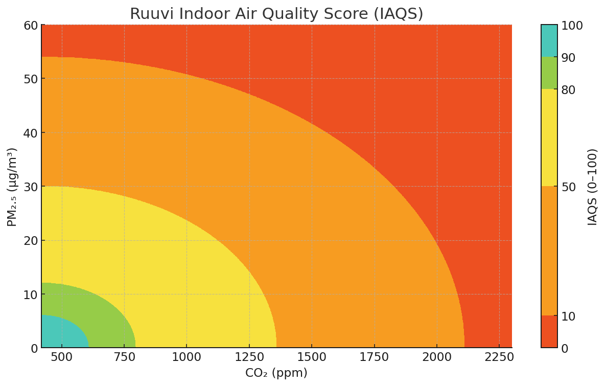 The Ruuvi Indoor Air Quality Score (IAQS) is designed to provide a quick and repeatable overview of the healthiness of current indoor air conditions. The index does not account for temperature or humidity, as these are more closely related to comfort and structural maintenance than to direct health effects. The IAQS considers CO₂ and particulate matter (PM₂.₅), as both can be measured as absolute values and their effects on health and well-being are well studied. The index is calculated by measuring each component’s deviation from its ideal value and using geometric distance to compute a combined “total difference” from the ideal.