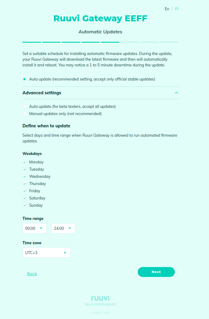 Under the "Advanced Settings", you can configure a schedule for installing updates - select weekdays and preferred timeslot: