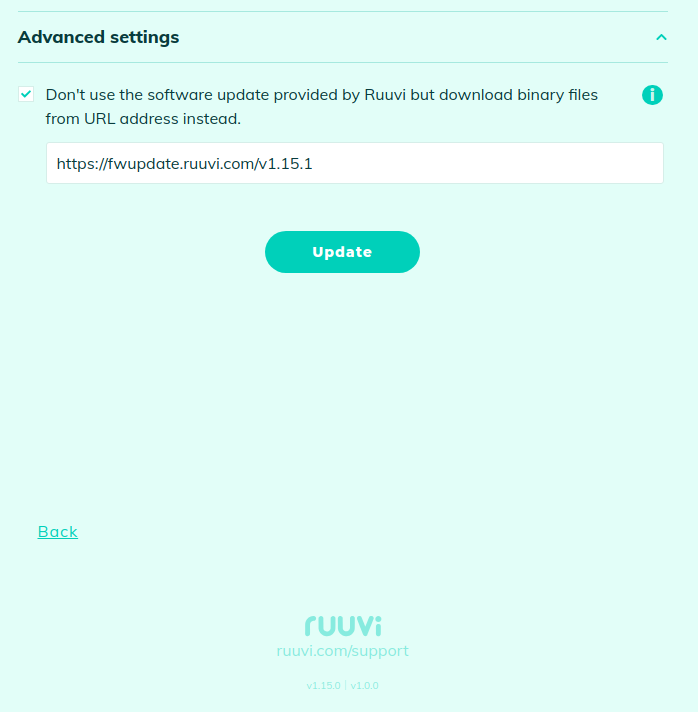 You can also install earlier or beta versions of the software by providing the URL to the required firmware. If you have built your own firmware, you can run HTTP server and provide the URL to your firmware binaries (See [gw-install-custom-firmware](https://docs.ruuvi.com/ruuvi-gateway-firmware/gw-install-custom-firmware "mention")).