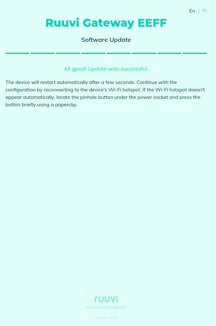 After the software update is completed, Ruuvi Gateway will be restarted in a few seconds, and the following page will be displayed: