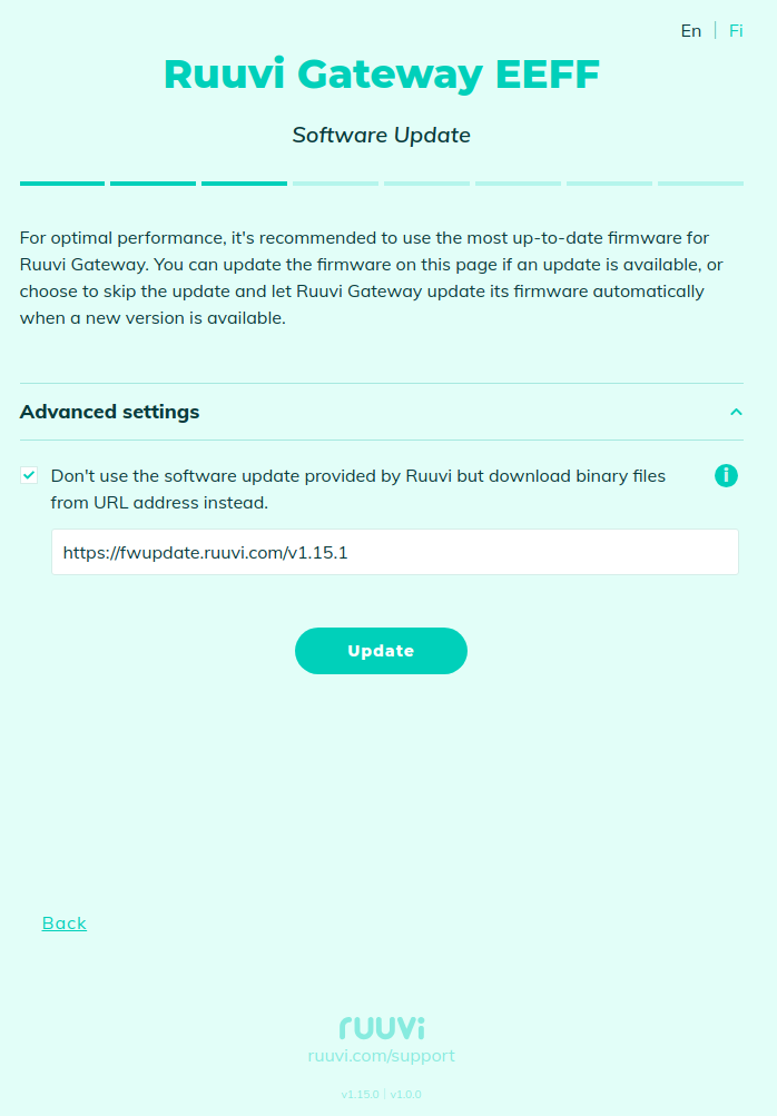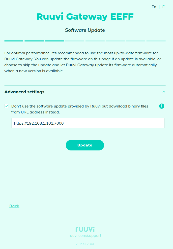Open Web-UI, go to "Software Update" page, expand "Advanced Settings" and enable the checkbox "Don't use the software update provided by Ruuvi but download binary files from URL address instead":